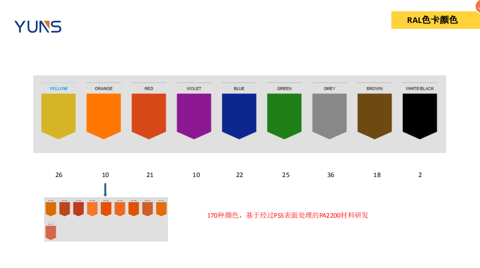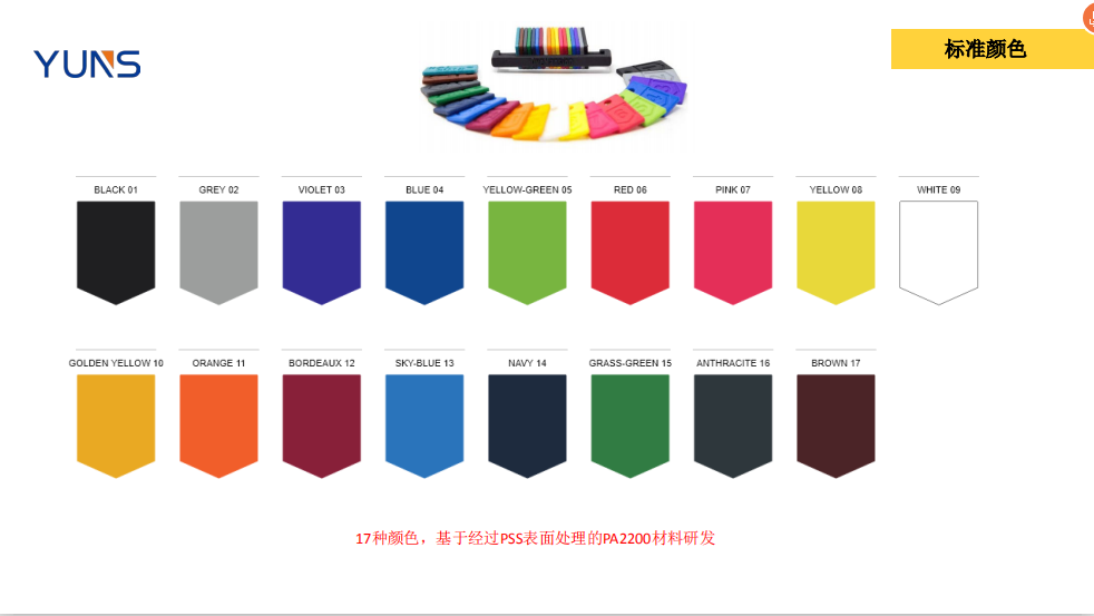 1. 浸染顏色的色卡材料都是進(jìn)口EOS的PA12來做的,使用其他材料也會(huì)造成顏色偏差;