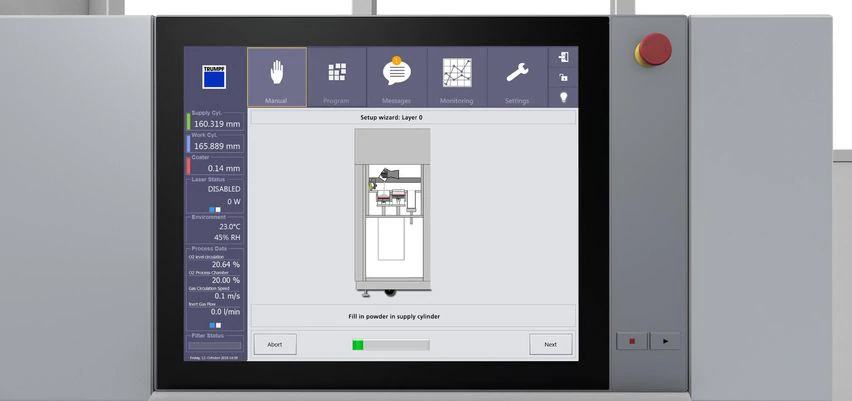安裝向?qū)箼C(jī)床操作輕而易舉!機(jī)床操作人員可直接通過(guò)機(jī)床人機(jī)界面調(diào)用 TruPrint 安裝向?qū)?。隨后,操作人員可以在向?qū)е兄鸩酵瓿筛鱾€(gè)工步,例如零層磨合。
