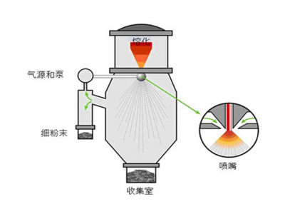 氣霧化制粉法是常見的粉末生產方法。元素原料在空氣或惰性氣體包層下或在真空下熔融。隨后用氣體回填該室,以迫使熔融合金通過高速空氣、氮、氦或氬氣體沖擊流動熔體并將其分解的噴嘴。粉末大多呈球形,其中存在一些不對稱的顆粒及伴生物。伴生物是在固化期間較小的顆粒粘附到較大的顆粒時形成的。爐容量范圍為5千克至3000千克。 尺寸范圍為0至500微米。在20到150微米范圍內的產量在總產量的10至50%之間波動。主要用于鎳、鈷和鐵的合金,也可用于鈦和鋁合金。