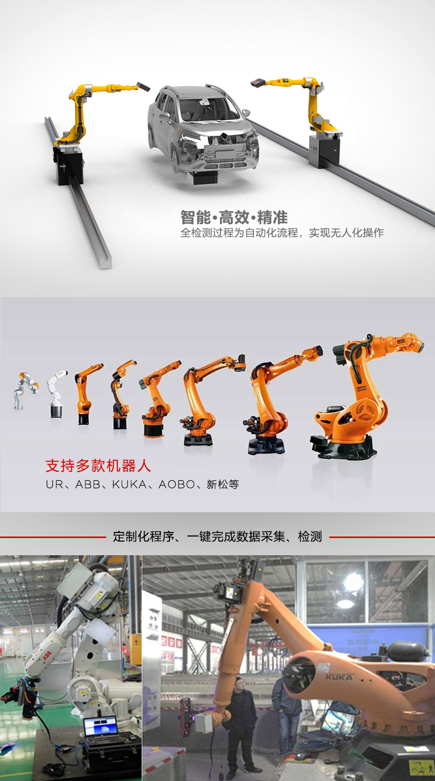 自動(dòng)化三維掃描系統(tǒng) 該系統(tǒng)具備自主學(xué)習(xí)路徑掃描,人機(jī)協(xié)作,自主規(guī)劃掃描路徑,可定制2D、3D視覺(jué)識(shí)別,一鍵自動(dòng)生成機(jī)器人程序。 自動(dòng)化三維掃描系統(tǒng) 機(jī)器人三維智能引導(dǎo)系統(tǒng)(RTIG),作為自動(dòng)化工業(yè)領(lǐng)域的應(yīng)用設(shè)備在今后將會(huì)發(fā)揮不可替代的作用。大到汽車(chē)產(chǎn)業(yè)的焊接作業(yè)、流水線(xiàn)的分類(lèi)挑選,小到單個(gè)物件的識(shí)別抓取等。而三維掃描儀憑借其高速度,高質(zhì)量的數(shù)據(jù)采集能力,在工業(yè)、文化領(lǐng)域都有廣泛的使用,而兩者相結(jié)合是機(jī)器視覺(jué)領(lǐng)域一直在嘗試推進(jìn)的一項(xiàng)很實(shí)際的應(yīng)用。來(lái)高科技(天津)有限公司經(jīng)過(guò)多年的研究開(kāi)發(fā),?將三維掃描儀與機(jī)器人結(jié)合,實(shí)現(xiàn)了全自動(dòng)數(shù)據(jù)采集和空間任意位置信息的獲取和計(jì)算。 技術(shù)特點(diǎn): 支持與機(jī)器人進(jìn)行多種方式交互通訊,可根據(jù)協(xié)議定制開(kāi)發(fā)。 設(shè)備輕量級(jí),根據(jù)機(jī)器人負(fù)載進(jìn)行定制。 掃描過(guò)程無(wú)需標(biāo)記點(diǎn),全自動(dòng)拼接。 全自動(dòng)掃描,并可根據(jù)需求輸出數(shù)據(jù)。 可根據(jù)實(shí)時(shí)掃描結(jié)果修正機(jī)器人工作路線(xiàn),實(shí)現(xiàn)在線(xiàn)編程。 根據(jù)掃描結(jié)果與數(shù)模比對(duì),輸出比對(duì)誤差,進(jìn)行修正、加工?、打磨等。 可定制2D、3D視覺(jué)識(shí)別,一鍵自動(dòng)生成機(jī)器人程序。 機(jī)器人智能3D數(shù)字化檢測(cè)系統(tǒng),將“一鍵式掃描”、“全尺寸檢測(cè)”、“人機(jī)協(xié)作”、“自動(dòng)檢測(cè)報(bào)告”、“自主學(xué)習(xí)”等優(yōu)勢(shì)完美融合。配合高像素、快速掃描的產(chǎn)品性能優(yōu)勢(shì),可以快速獲取三維數(shù)據(jù)。該系統(tǒng)具備自主學(xué)習(xí)路徑掃描,人機(jī)協(xié)作,自主規(guī)劃掃描路徑,可定制2D、3D視覺(jué)識(shí)別,一鍵自動(dòng)生成機(jī)器人程序。? 技術(shù)特點(diǎn): ? ? ??? 掃描過(guò)程無(wú)需標(biāo)記點(diǎn),全自動(dòng)拼接。 ? ? ????全自動(dòng)掃描,并可根據(jù)需求輸出數(shù)據(jù)。 ? ? ????根據(jù)掃描結(jié)果與數(shù)模比對(duì),輸出比對(duì)誤差。 ? ? ????可定制2D、3D視覺(jué)識(shí)別,一鍵自動(dòng)生成機(jī)器人程序。 ? ? ????應(yīng)用于工業(yè)自動(dòng)化流水線(xiàn)的快速檢測(cè)。 更多詳情請(qǐng)點(diǎn)擊——自動(dòng)化三維掃描系統(tǒng) 上一頁(yè) 下一頁(yè)